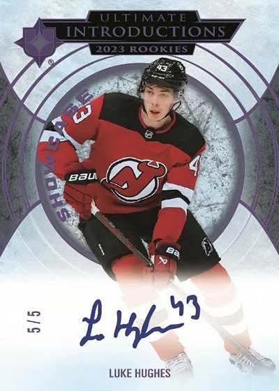 More rookie content is available in Ultimate Introductions (1:3 packs) and Ultimate Introductions Showcase (1:32 packs). Both have Gold (/49), Purple (/25) and Black (/5) parallels. Autographs are 1:5 packs or 1:80 for Showcase cards. Gold, Purple (/10 or less) and Black (1/1) signatures are also in the product.