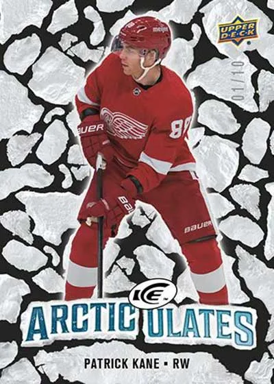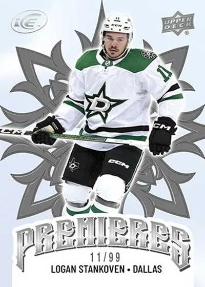 Ice Premieres offer up more rookies, this time using acetate. Depending on the player, there are five levels of print runs numbered to either /999, /799, /499, /249 or /99. Parallels include Blue (/599), Green (/399), Gold (/25) and Black (1/1). These also get the hit treatment with Jersey (1:60), Autograph (/199 or /99), Patch (/25), Auto Patch (/10) and Auto Patch Black (1/1) versions.