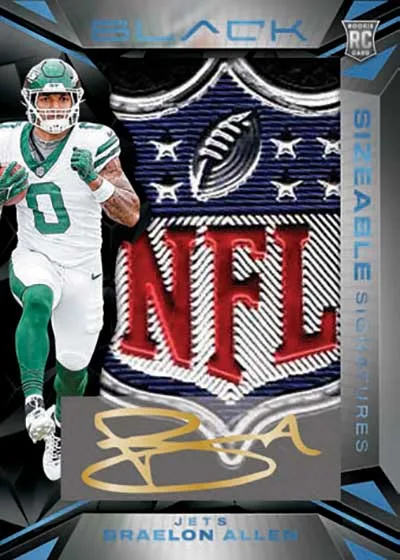 2024 Panini Black Football offers a dark look at the NFL. That’s by design, creating an aesthetic that is different from most other releases. One similarity, though, is its configuration. Stressing high-end elements, three of the five cards in every hobby box are hits. This includes one rookie patch autograph along with a second signature card.