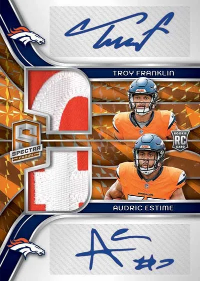 The base RPAs aren’t the only autographed memorabilia cards on the 2024 Panini Spectra Football checklist. Others include Radiant Rookie Patch Signatures, Aspiring Patch Autographs, Dual Patch Autographs.