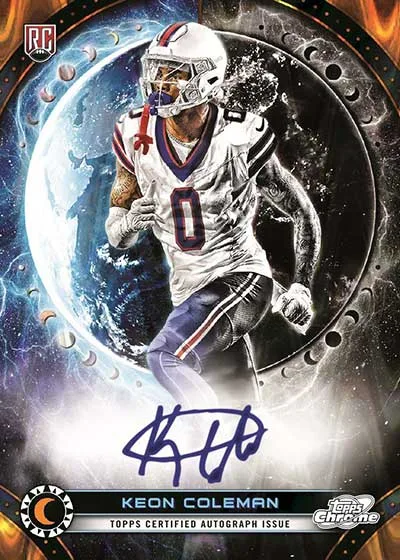 2024 Topps Cosmic Chrome Football launches into orbit with lots of bit designs inspired by outer space and beyond. Like other Topps Chrome releases, Refractors are plentiful. However, autographs are not. They’re on the checklist but they’re not a guarantee in hobby boxes. They combine to land approximate every third box.