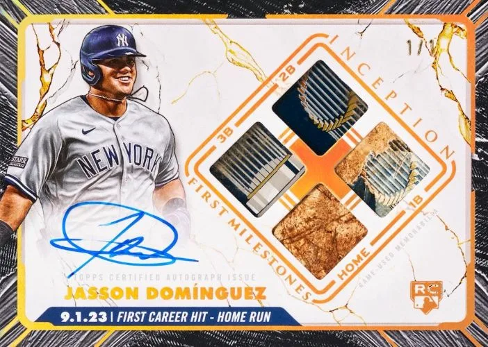 Two players are specially featured: Jasson Dominguez with a slice of each base he touched after his first home run and cards featuring a base used from Elly De La Cruz’s first career homer. Both players have Red (/25), Orange (/10), Blue (/5), and Inception (1/1) parallels.