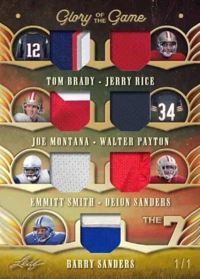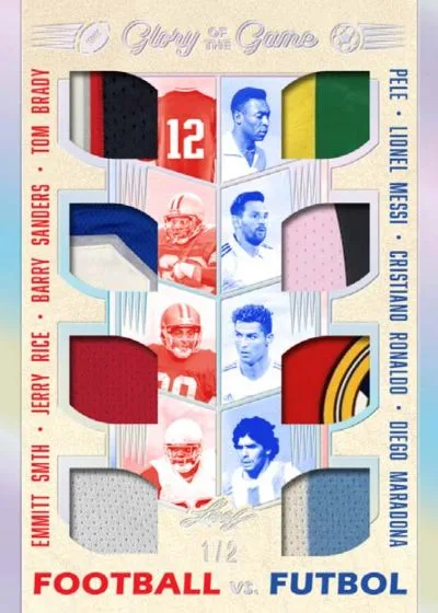 In Football vs. Futbol, Leaf combines four jersey pieces from NFL players with four jersey pieces from soccer players, while The Seven Jerseys combine jersey relics from seven players.