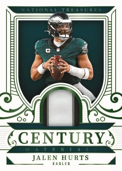 Century Materials, a long-running memorabilia subset within National Treasures, returns with a new crop of game-used and player-worn pieces. NFL Shields are featured not only as part of signature sets but also as a standalone memorabilia chase, spotlighting top current stars and retired greats with shield patches.