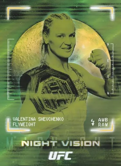 Base cards are well-designed with colorful accents and a background that alludes to a night sky that silhouettes pine trees. The fighters’ image is also reflected in the background.